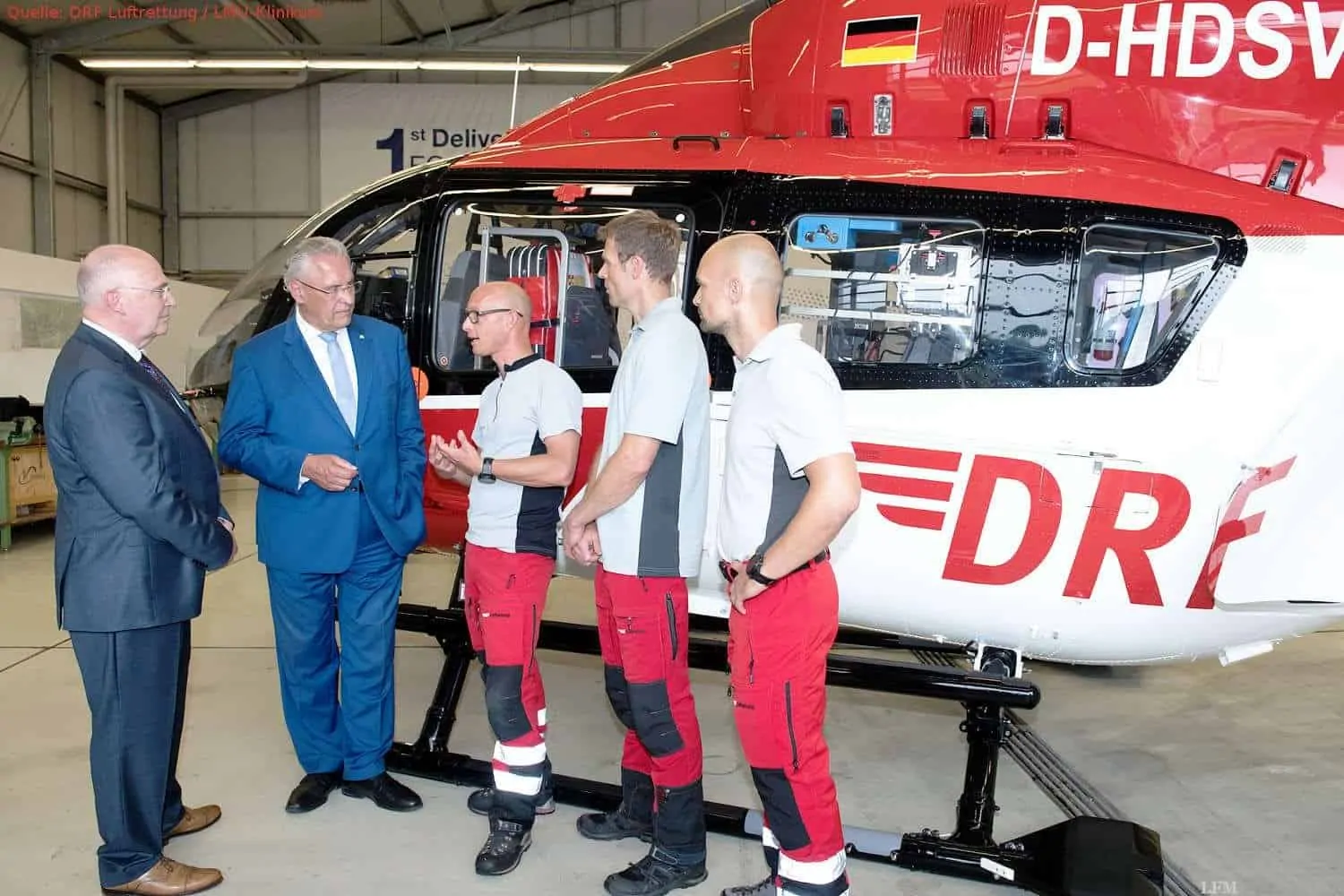 Bundesweit setzt die DRF Luftrettung an 29 Luftrettungsstationen in Deutschland sowie an zwei Stationen in Hubschrauber für die schnelle und für dringende Transporte von Intensivpatienten zwischen Kliniken ein. Pro Jahr leistet sie rund 40.000 Einsätze. Auf dem Titelbild (v.l.n.r.): Dr. Peter Huber (Vorstand DRF Luftrettung) und Joachim Herrmann (Innenminister Bayern) im Gespräch mit Notarzt Dr. Andreas Beyer, Sascha Netzer und Notfallsanitäter Andreas Adams. Die Tabelle zeigt die Einsatzzahlen der Rettungshubschrauber in Bayern.