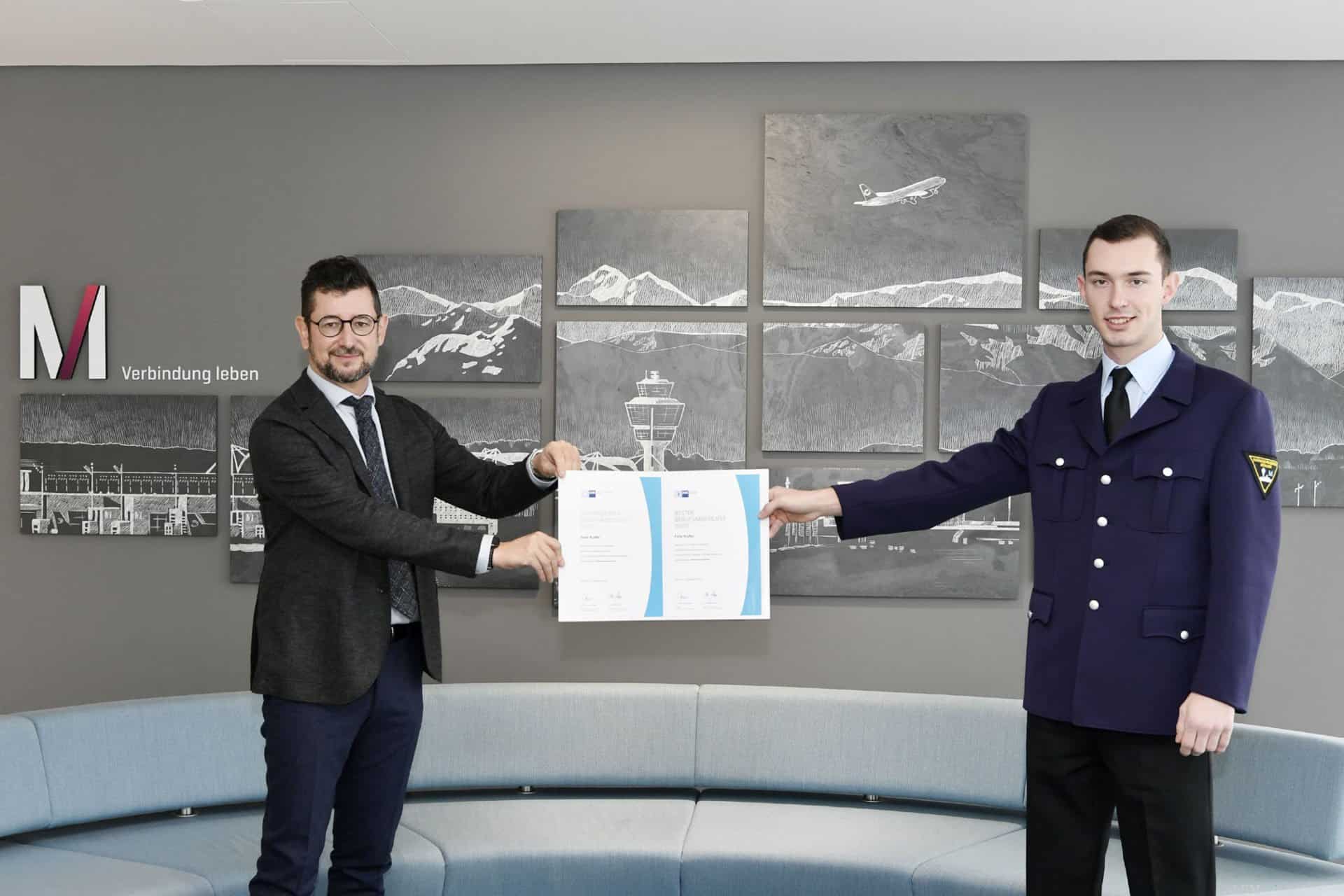 Als „Jahrgangsbester“ unter allen bayerischen Feuerwehrleuten, die in diesem Jahr ihre Berufsausbildung abgeschlossen haben, wurde jetzt der bei der Flughafen München GmbH (FMG) ausgebildete Felix Kuffer (rechts) ausgezeichnet. „Wir sind stolz darauf, dass wir trotz der durch die COVID-19-Pandemie erschwerten Rahmenbedingungen so großartige Ergebnisse in der Berufsausbildung erzielen“, erklärte Scharpf.