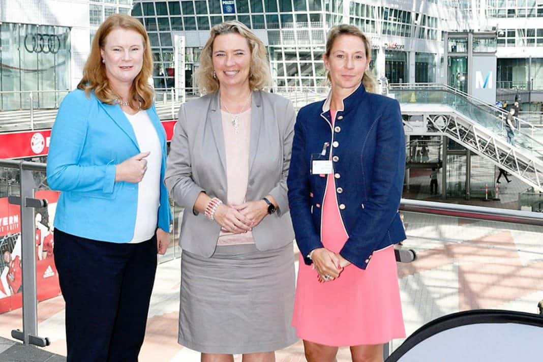Auf dem Foto präsentieren sich die Schirmherrin der Veranstaltung, die Bayerische Staatsministerin für Familie, Arbeit und Soziales, Kerstin Schreyer, MDL, (Mitte) mit den Gastgeberinnen Andrea Gebbeken, Geschäftsführerin Commercial und Security der Flughafen München GmbH und Schirmherrin der „MStars“ (links) und Vanessa Haumberger, Leiterin Politische Angelegenheiten und Gründerin der „MStars“ (rechts).