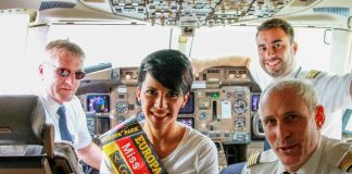Miss Condor im Cockpit der Boeing 757