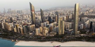 Erkundungsflug vor der Skyline von Abu Dhabi