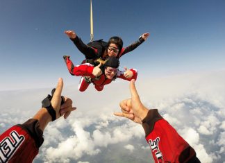 Tandemmasterin bringt die Männer am Fallschirm nach unten