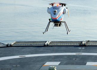 Helikopterdrohne landet mit Magnetanker auf Schiff
