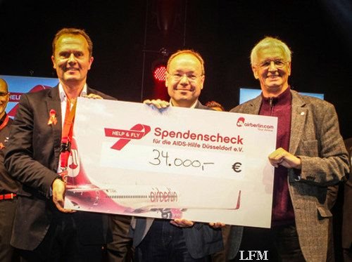 Der gesamte Erlös von "Help & Fly" kommt der AIDS-Hilfe Düsseldorf. e.V. zugute. Karl-Hermann Hansen, PR-Manager airberlin (links) Peter von der Forst, Geschäftsführer der AIDS-Hilfe Düsseldorf e. V. (Mitte) und Bürgermeister Günter Karen-Jungen (re.) bei der feierlichen Scheckübergabe im Anschluss an den Rundflug. Insgesamt 34.000 Euro kamen für den guten Zweck zusammen.