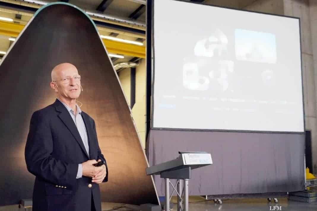 Inmitten der Industriehalle, wo sonst Produkte für Satelliten und Trägerraketen gefertigt werden, unterstrich Nicollier gegenüber knapp 200 Mitarbeitenden von Ruag Space den gesellschaftlichen Wert der Raumfahrt, die Rolle der Schweiz und den Beitrag der Industrie zum Gelingen der Missionen.